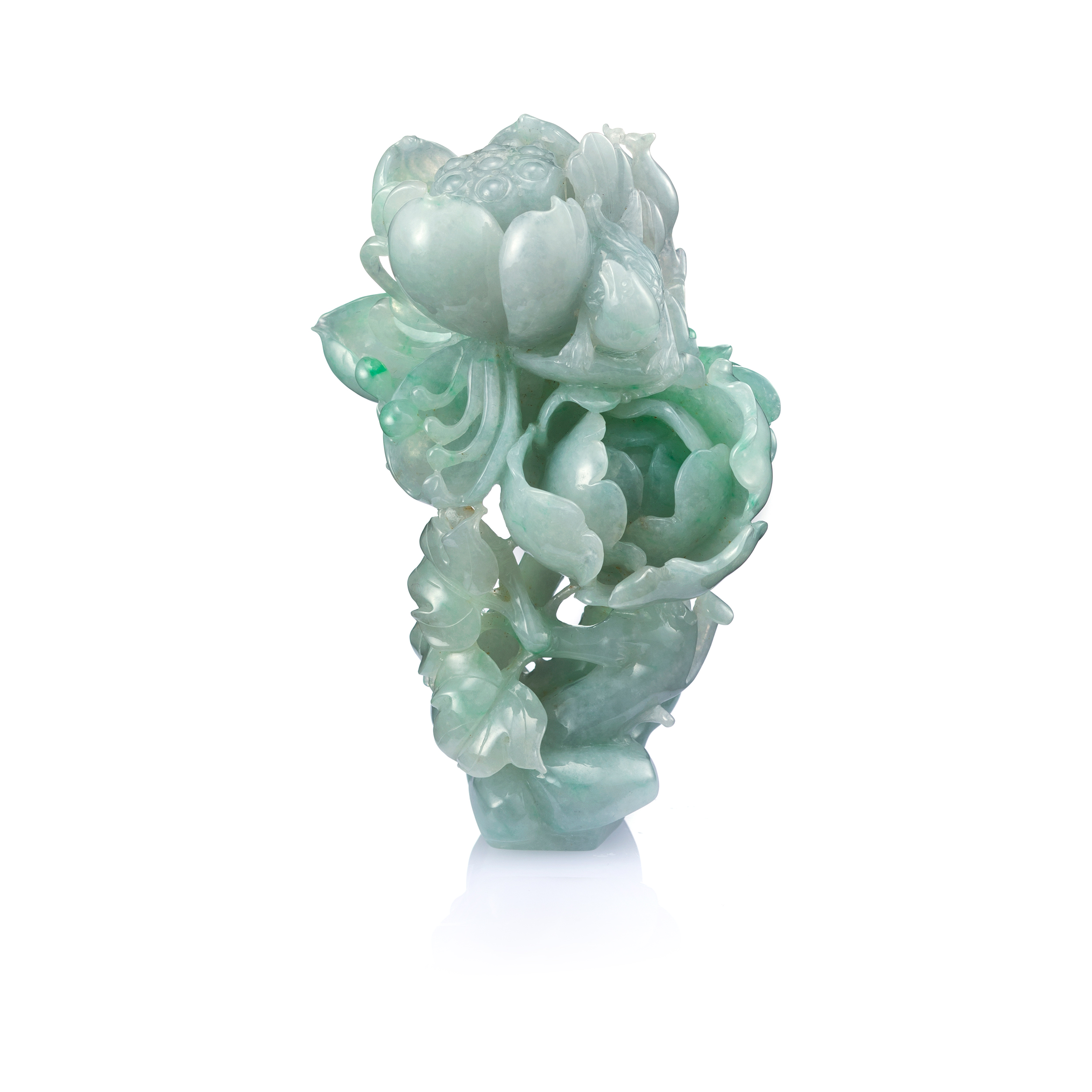 翡翠質地,溫潤且堅韌,氣韻脫俗,雕作牡丹主題,除了傳達富貴佳旨,亦可同時欣賞細膩的玉作技藝,作玉者結合圓雕或透雕或浮雕等技法,精湛的構圖與琢磨的手藝,將花葉的飽滿、垂滴的露珠、蟲或鳥或獸的動態等,表現得栩栩如生,無論珠寶或雕件,既透散著溫文儒雅的柔情靈性,也綻放了永恆的繁盛與貴氣。