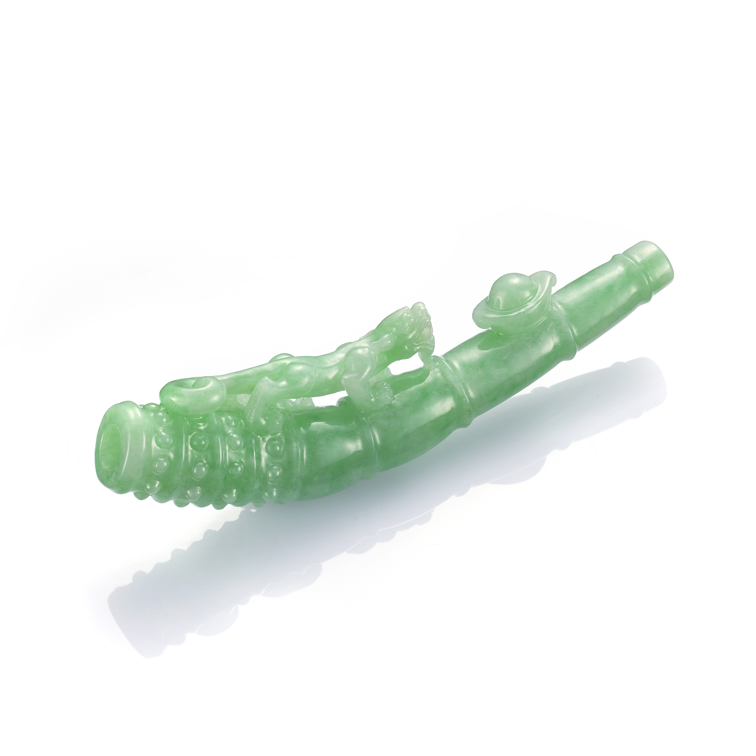 翠玉菸嘴,古韻盎然,有雋朗之氣。吞雲吐霧、談笑風生間,大局底定,富貴在握,便是錚錚然的風雲人物;細觀此作,其上,有螭虎,有元寶,刻工精巧,亦是王者風範、財祿鴻運的象徵。
