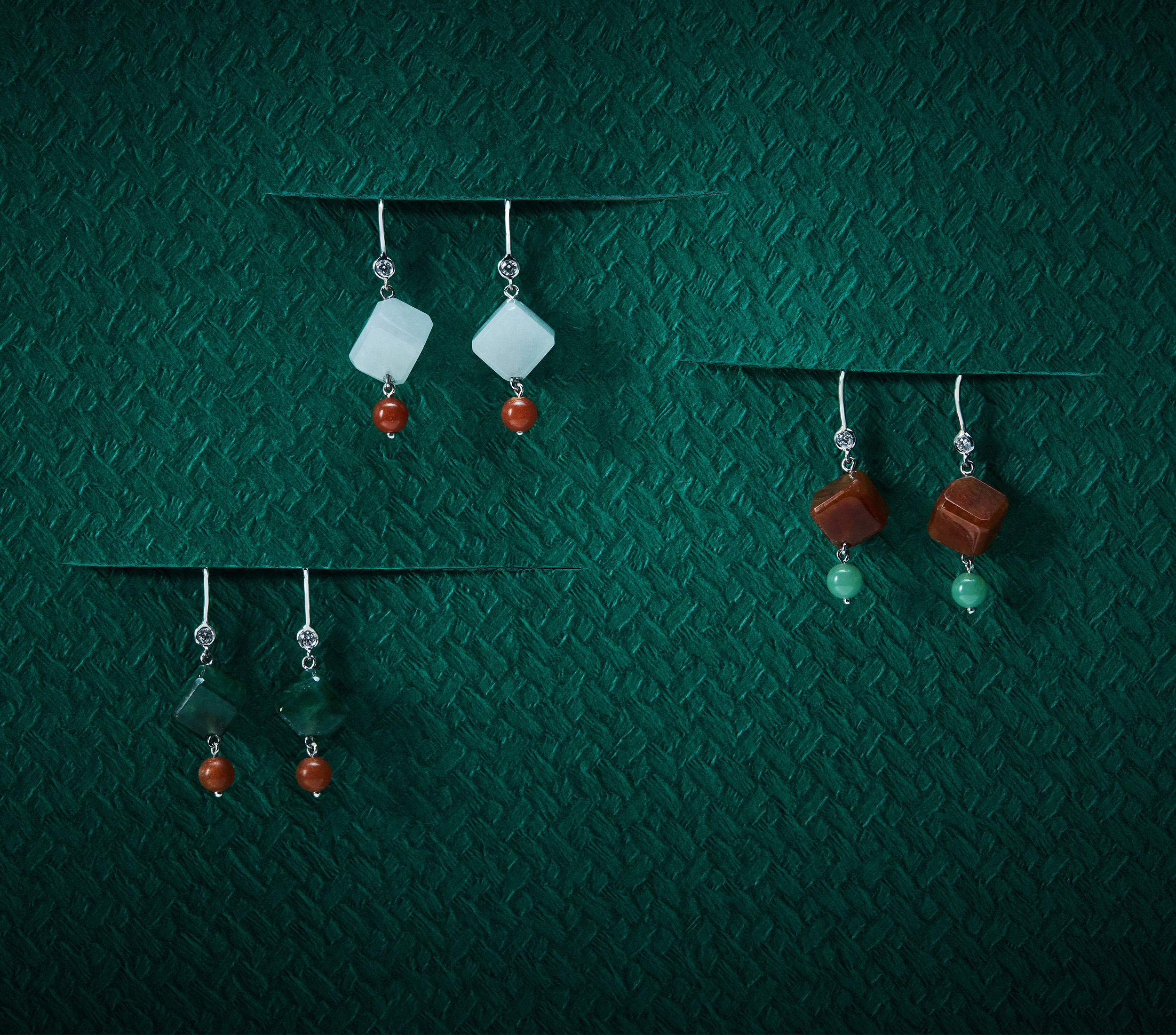 幾何形制的表現,是美學領域中最經典的創意原型,亦是時尚界永不褪流行的靈感元素,【小玩意】翡翠耳環系列,以溫潤多彩的翡翠為主石,將其琢磨為方塊與圓珠,再點襯宛如星光的鑽飾,綠翠與白翡以及紅翡,巧妙的顏色配搭,詮釋出不同的個性丰采,是充滿青春顏值的輕珠寶款式。