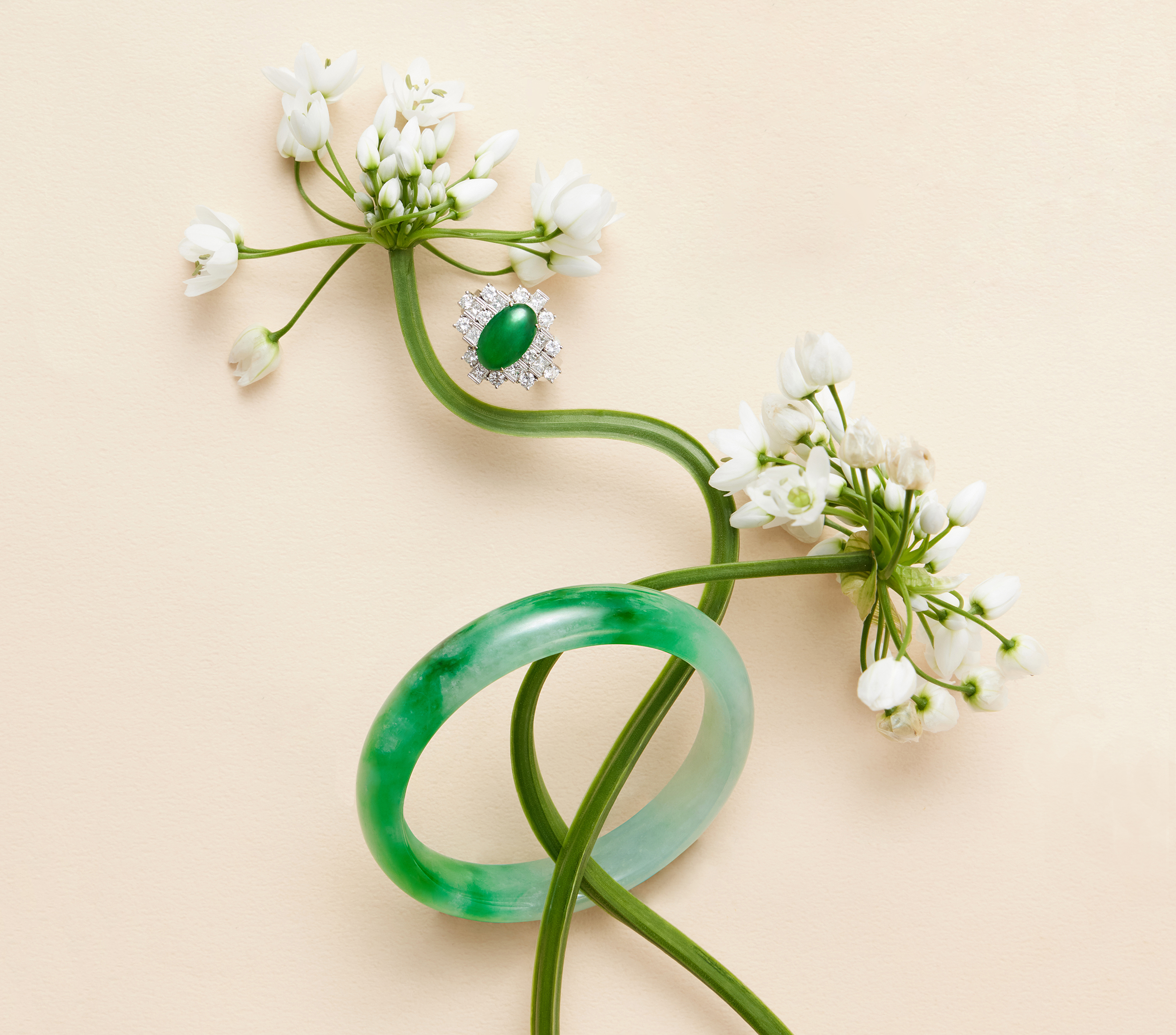 本系列所精選的翡翠玉鐲,質色俱優,春色如錦的綠意,映眼也映心,盎盎然的翠色,煥然了玉腕,也煥然了內蘊的美麗,華貴韻致,表露無遺,極具收藏價值。另有翡翠戒指,質地清潤,玉色勻潔,經典蛋面,襯以層層鑲嵌的鑽飾,方與圓,璀璨與圓融,展現落落大方之美。