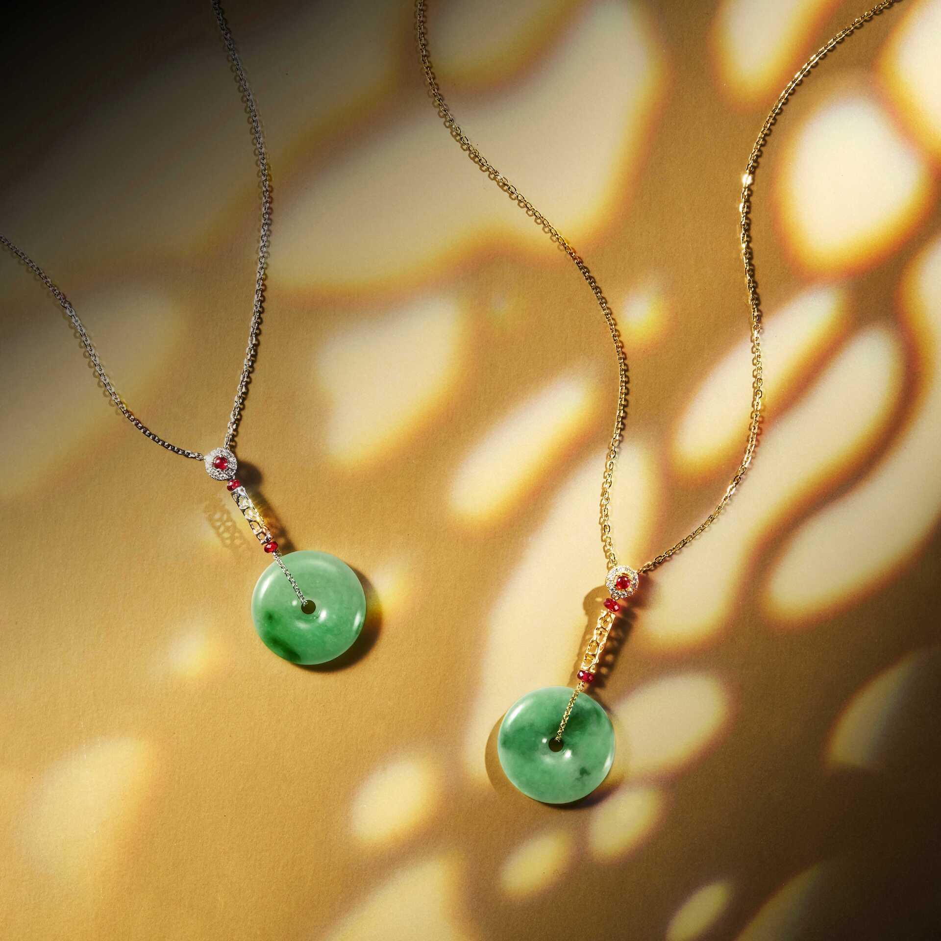 【華燈燦】系列,延伸並愈加璀璨了【華燈映】的創意靈思,美學風格則散發出更為嫵媚、華貴的韻味。兩者皆以經典的古錢造型為主體,象徵永恆的安平富貴;墜身設計,則以古代皇室宮廷裡的宮燈為本,擷取其形式之美、意境之雅,賦以現代感的視覺觀點,結合翡翠玉質的溫潤,詮釋出此款深具東方美學風情的鏤空珠寶系列。