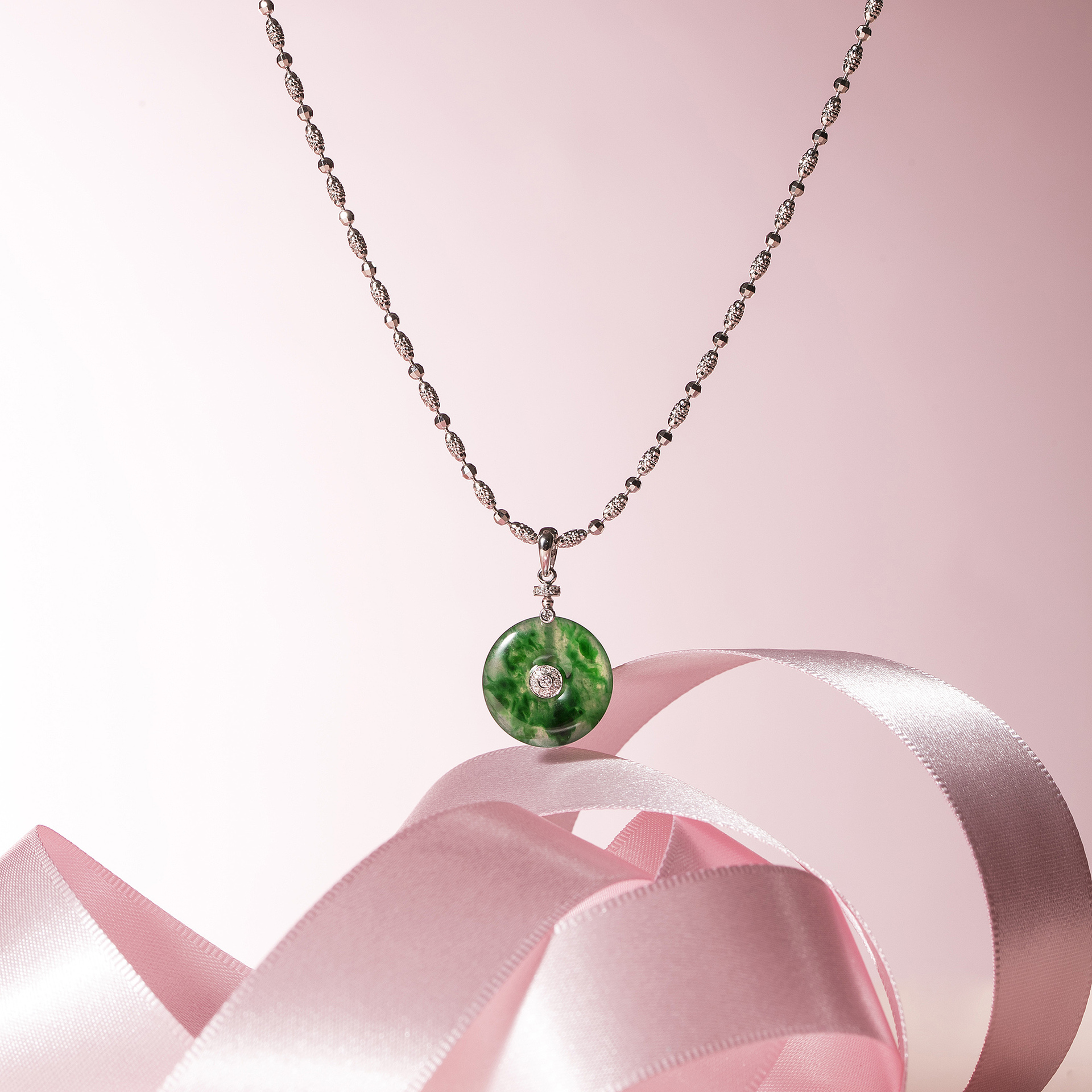 【春暉】翡翠鑲鑽項鍊,以綠色翡翠為主石,呼應2018春夏最新流行的綠色系,帶著經典卻又摩登時尚的韻味,詮釋兒女心中母親的美麗意象。JADEGIA玉世家以經典的古錢造型設計,留存富貴圓滿的吉祥寓意,搭配耀眼的鑽飾鑲嵌,優雅華貴中更勾勒出歷經豐富淬鍊後的從容靈動。