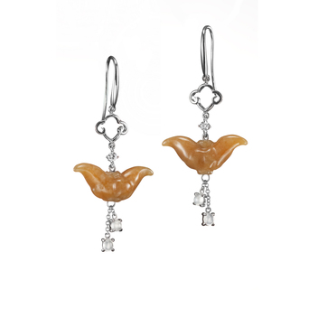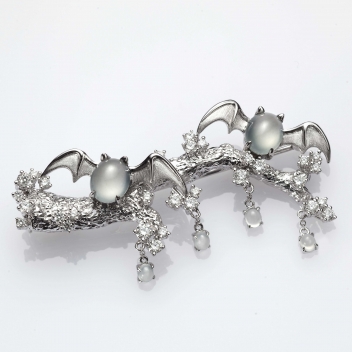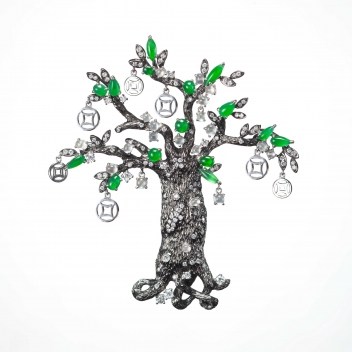 JADEGIA玉世家全新新春珠寶系列中,【巧伶俐】、【雙福燦】與【如魚得水】共四款設計,以菱角、蝙蝠、金魚等中國文化意涵裡經常出現的祥瑞圖騰,寄寓著聰慧伶俐、福從天降、年年有餘等人生樂事;而【一樹燦爛】翡翠與白翡鑲鑽胸針,則以樹之燦爛,借喻人生,人生之美,理應美得如此繁華精彩!